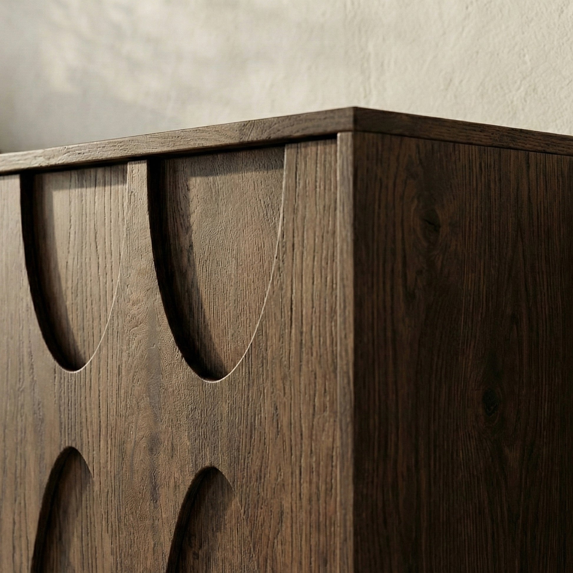 È un mobile che non cerca l’attenzione, ma la conquista attraverso le proporzioni, la matericità e una presenza calma e misurata.